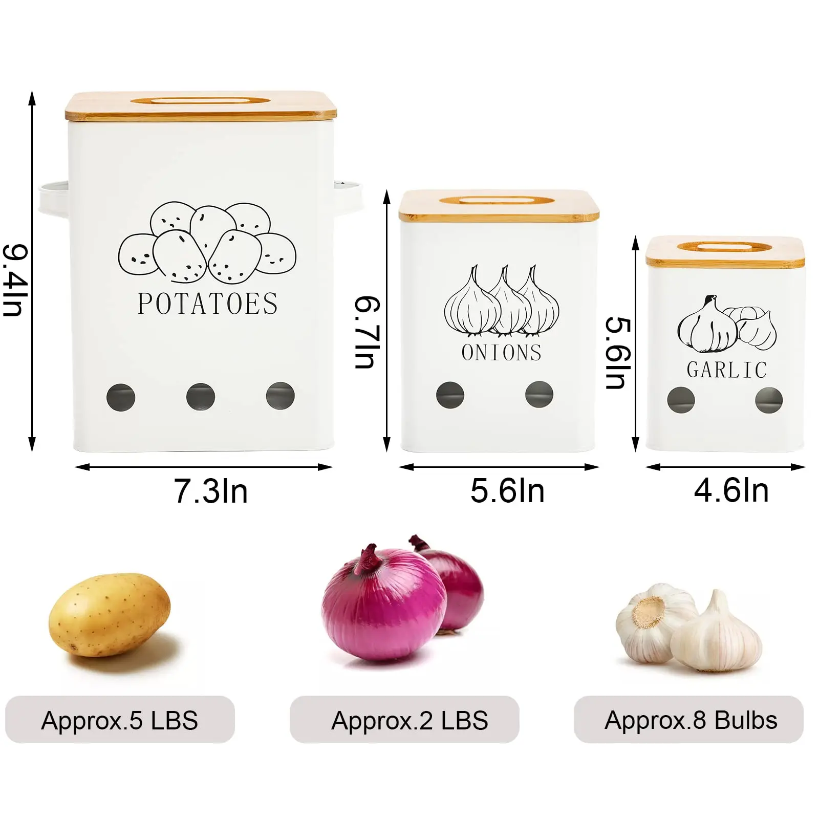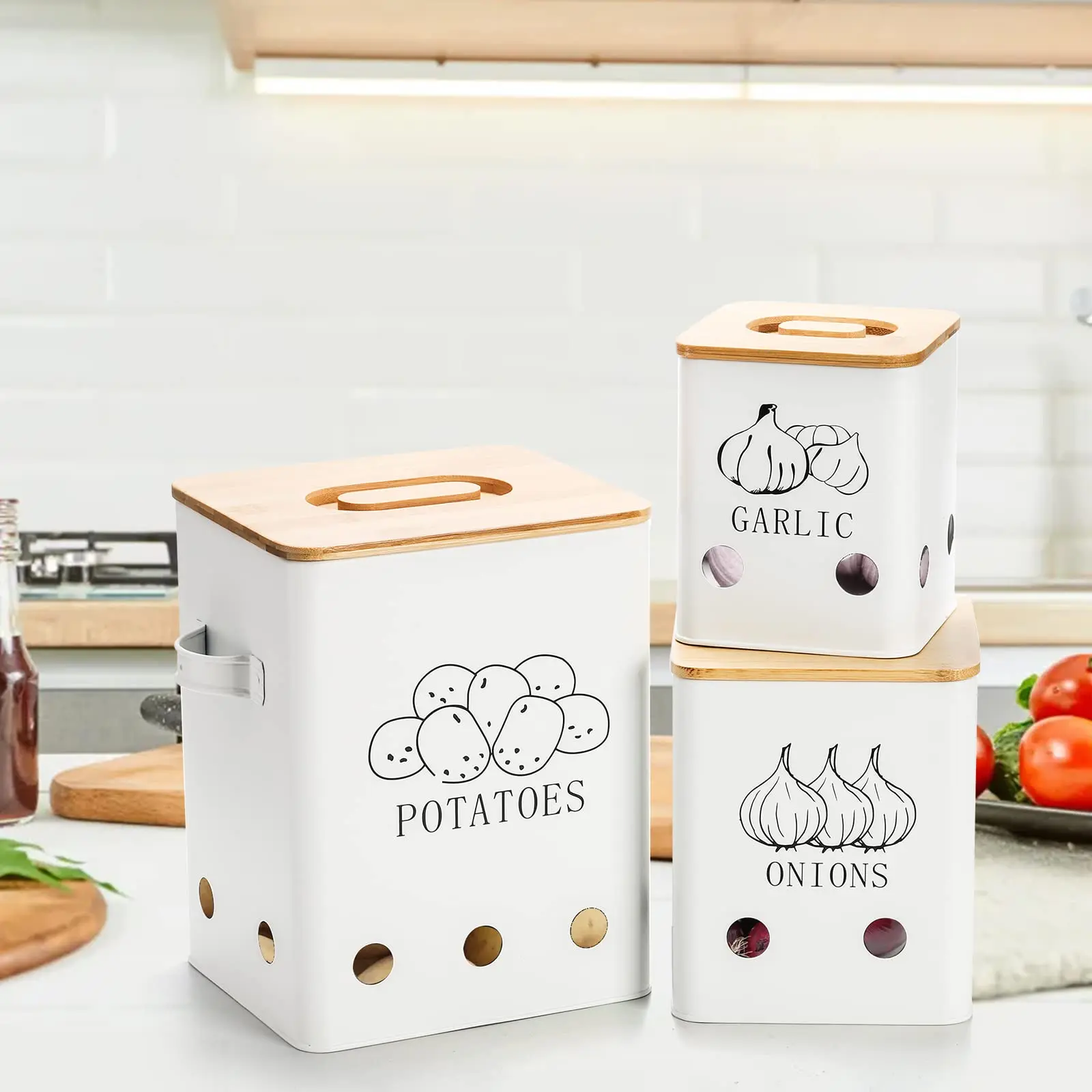工厂定制金属洋葱大蒜土豆罐套装厨房罐蔬菜保鲜容器带孔和木盖