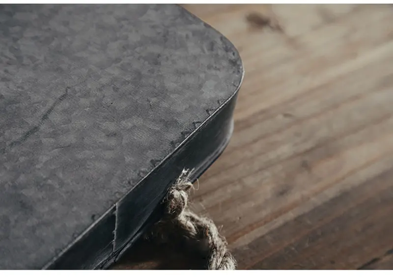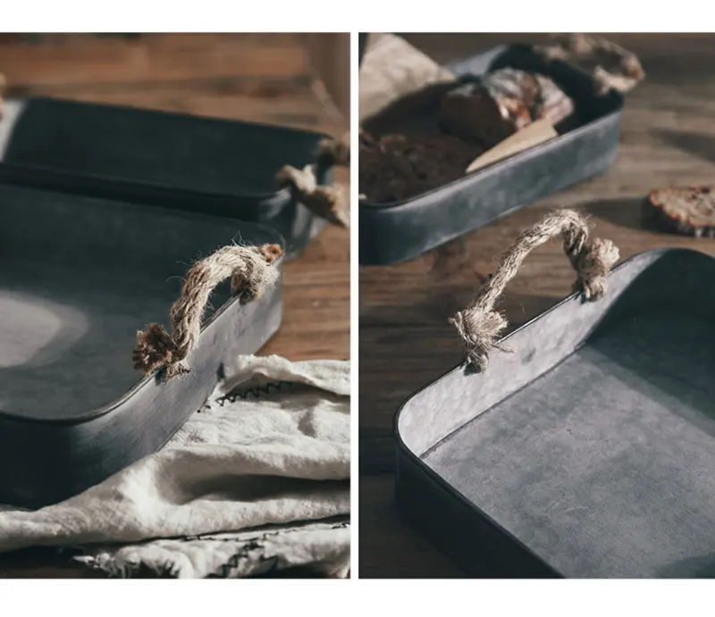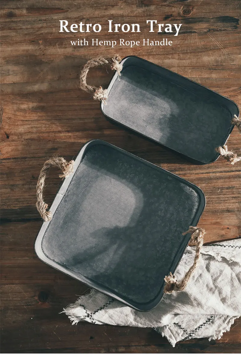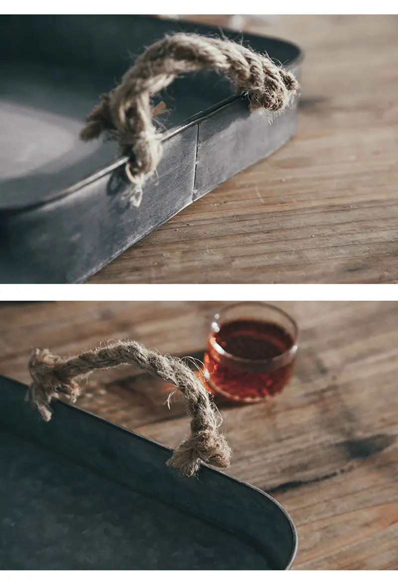 1.复古铁艺收纳托盘,麻绳提手设计。